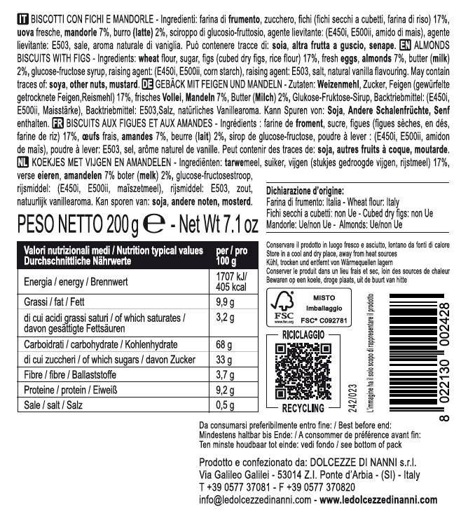 Inhaltsstoffe: Weizenmehl, Zucker, Feigen (getrocknete Feigen in Würfeln, Reismehl) 17%, frische Eier, Mandeln 7%, Butter (Milch) 2%, Glukose-Fruktose-Sirup, Backtriebmittel: (E450i, E500ii, Maisstärke), Backtriebmittel: E503, Salz, natürliches Vanillearoma.