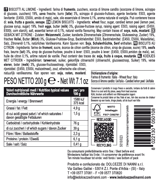 Inhaltsstoffe: Weizenmehl, Zucker, kandierte Zitronenschale (Zitronenschale, Glukosesirup, Zucker) 19%, frische Eier, Butter (Milch) 3%, Glukose-Fruktose-Sirup, Backtriebmittel: E503, Backtriebmittel: (E450i, E500ii, Maisstärke), Salz, ätherisches Zitronenöl 0,1%, natürliches Vanillearoma.