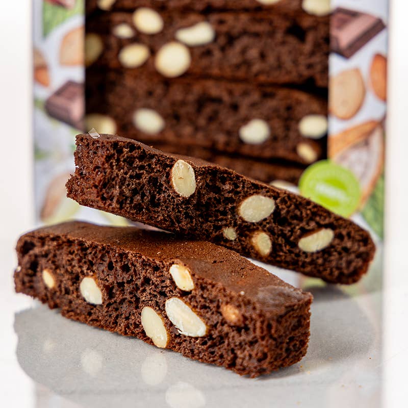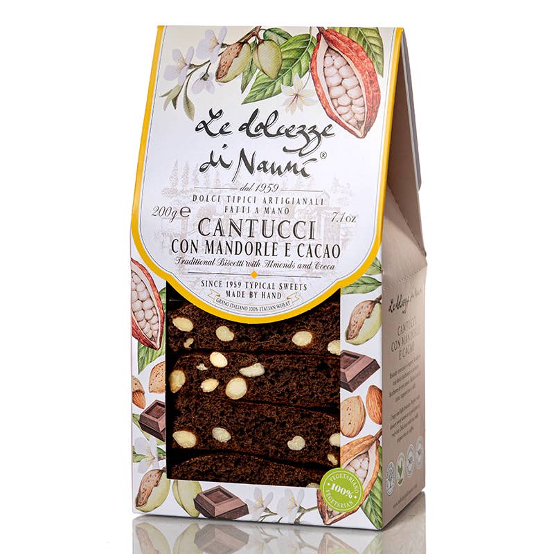 Die toskanischen Klassiker in einer verführerischen Variante: Knusprige Cantucci mit edlem Kakao und ganzen Mandeln. Sorgfältig von Hand gefertigt nach traditioneller Rezeptur überzeugen sie mit feinem Biss, ausgewogener Süße und einer dezent schokoladigen Note.