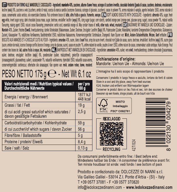 Zutaten: Mandeln 40%, Zucker, frisches Eiweiß, Invertzuckersirup, dunkle Schokolade (Kakaomasse, Zucker, Dextrose, Emulgator: Lecithin (Soja)) 6%, Puderzucker (Zucker, Maisstärke), kandierte Orangenschale (Orangenschale, Glukosesirup, Zucker), Kakaopulver 1%, natürliches Vanillearoma, Backtriebmittel: E503, natürliches Kakaoaroma, Konservierungsmittel: Sorbinsäure, ätherisches Orangenöl.