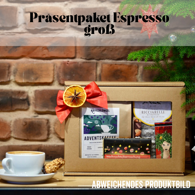 Erstmalig bieten wir dieses Jahr Weihnachtspräsente an. Wir unterscheiden im wesentlichen zwischen kleinen Präsentpaketen (300g Kaffee, 1 x italienisches Gebäck, 1 x Zotter Schokolade) und großen Präsentpaketen (500g Kaffee, 1 x italienisches Gebäck, 2 x Zotter Schokolade).