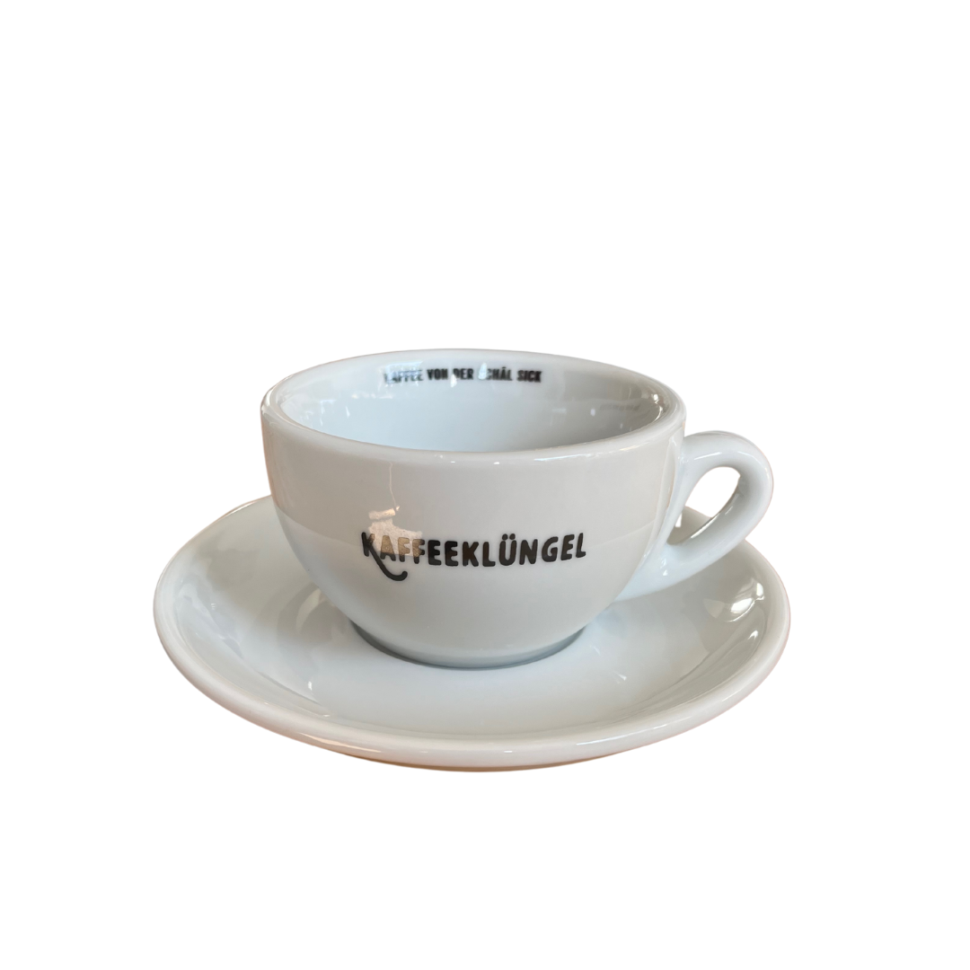 Endlich sind sie da! Unsere Caffè Latte/Flat White Tassen mit Kaffeeklüngel Logo und Schriftzug im Innenbereich. Hergestellt wurden unsere Tassen von Nuova Point in Italien und sind deshalb besonders schwer und dickwandig.